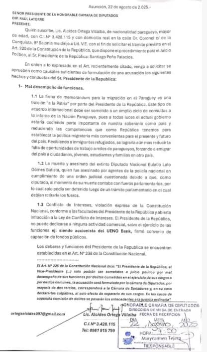 https://www.rdn.com.py/2025/08/18/santiago-pena-sobre-acuerdo-de-asilo-no-es-una-politica-transaccional/Ortega dirigió su escrito al presidente de la Cámara Baja, Raúl Latorre, fundamentando su pedido en el artículo 238 constitucional que permite someter a juicio político a presidente y vicepresidente por mal desempeño, delitos en ejercicio del cargo o delitos comunes.