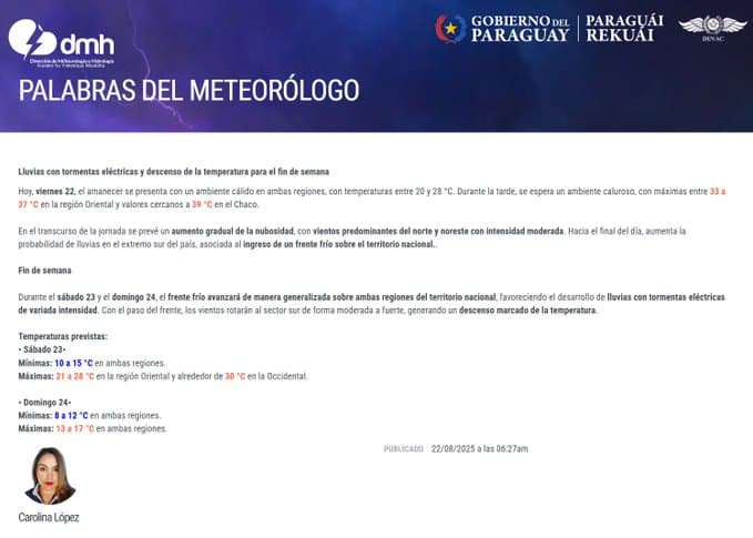 El viernes se presenta con un ambiente cálido desde las primeras horas, pero las temperaturas aumentarán con rapidez durante la jornada, según la Dirección de Meteorología e Hidrología (DMH). La tarde se perfila sofocante, con valores que oscilarán entre 33 y 37 °C en la Región Oriental, mientras que en el Chaco podrían rozar los 39 °C.
