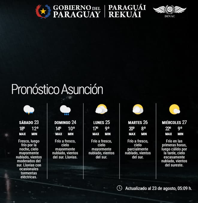 Junto con las tormentas, se esperan vientos moderados provenientes del sector sur, lo que provocará un ambiente más fresco. Este cambio de masa de aire frío marcará un descenso paulatino de las temperaturas, que podría acentuarse entre la noche del domingo y la jornada del lunes 25.