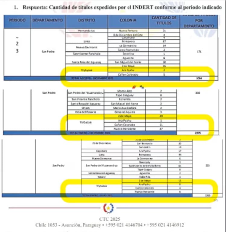 El detalle del reporte evidencia que entre agosto y diciembre de 2023 se otorgaron 1.004 títulos, mientras que en 2024 se sumaron 2.375 y, entre enero y julio de 2025, apenas 1.313. Caaguazú encabeza la lista de departamentos con más escrituras concretadas (1.253), seguido por San Pedro con 716, Alto Paraná con 676 y Canindeyú con 432.