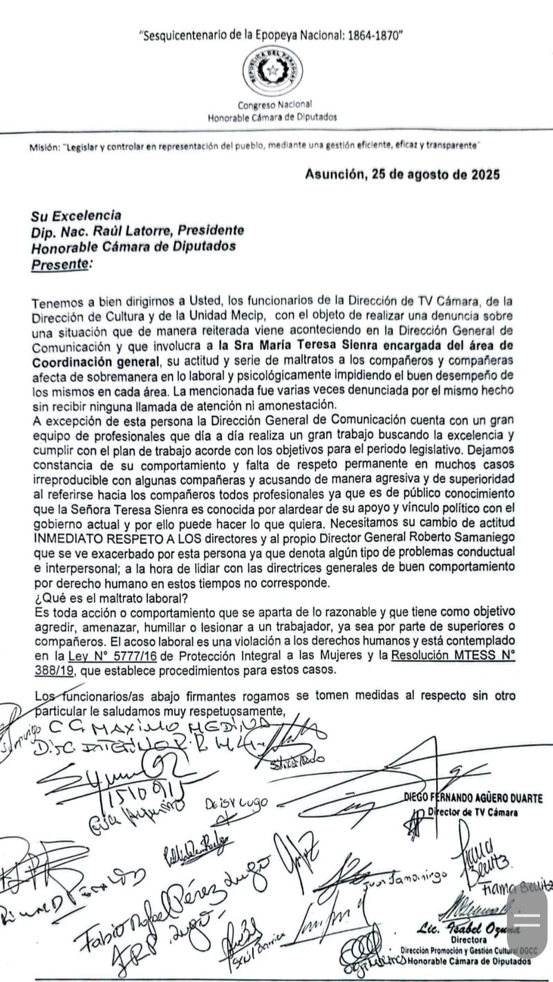 Un conflicto interno salió a la luz en la Cámara de Diputados tras la denuncia presentada por funcionarios del área de Comunicación contra su superiora, María Teresa Sienra, encargada de la Coordinación General. La nota dirigida al presidente de la institución, Raúl Latorre, expone acusaciones de maltrato laboral, abuso de autoridad y prepotencia.
