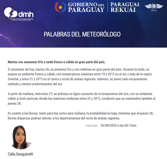 El amanecer de este martes 26 se presentó con un ambiente frío y presencia de neblinas en amplias zonas del país. La Dirección de Meteorología informó que, durante la tarde, las condiciones serán más agradables, con un clima fresco a cálido y temperaturas que oscilarán entre 19 y 20 °C en el sur y este de la Región Oriental, y entre 21 y 24 °C en el centro y norte de ambas regiones.