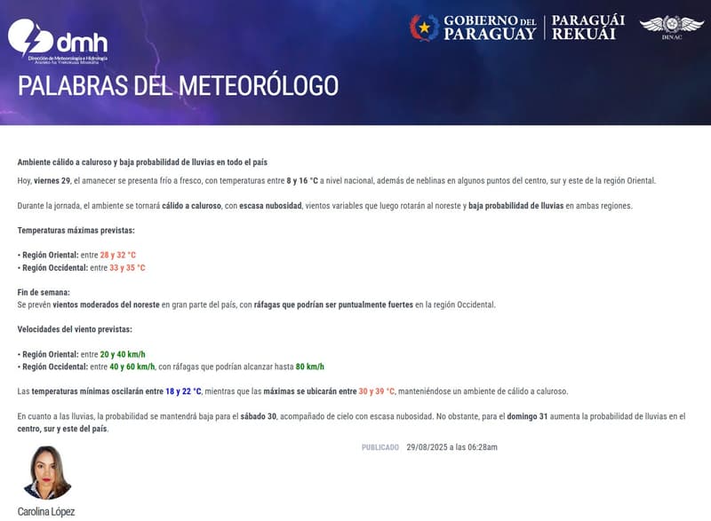 El amanecer de este viernes 29 se presentó con un ambiente frío a fresco, acompañado de temperaturas mínimas que oscilaron entre 8 y 16 °C. En algunas zonas del centro, sur y este de la región Oriental se reportaron neblinas matinales, que fueron disminuyendo con el correr de las horas.