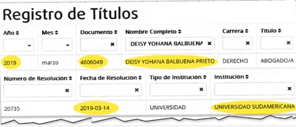 La web de Registro de Títulos del MEC señala que Deisy Balbuena egreso de la Universidad Sudamericana en 2019.