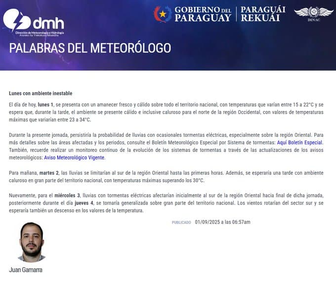 La Dirección de Meteorología advirtió que la jornada se mantendrá inestable. Existe una alta probabilidad de lluvias acompañadas de tormentas eléctricas, con mayor impacto sobre la Región Oriental. Las autoridades recomendaron seguir de cerca las actualizaciones de los avisos meteorológicos y el Boletín Especial por sistemas de tormentas.