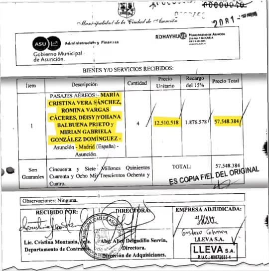 El costo de cada pasaje fue de G. 12.510.518, con un recargo del 15%. Además, tanto Vera como Vargas recibieron viáticos por G. 10.647.346 cada una, mientras que Vera sumó una beca de G. 1.400.000 otorgada por la Facultad Politécnica de la Universidad Nacional de Asunción.