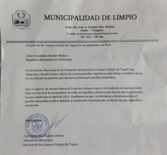 El intendente de Limpio, Optaciano Gómez Verlangieri, sorprendió con un pronunciamiento público en el que manifestó su apoyo a Venezuela, en un contexto marcado por la tensión diplomática entre ese país y Estados Unidos. A través de una nota, aseguró que una eventual guerra afectaría principalmente al pueblo venezolano, comparando la situación con la tragedia que vivió Paraguay durante la Guerra de la Triple Alianza (1864-1870).