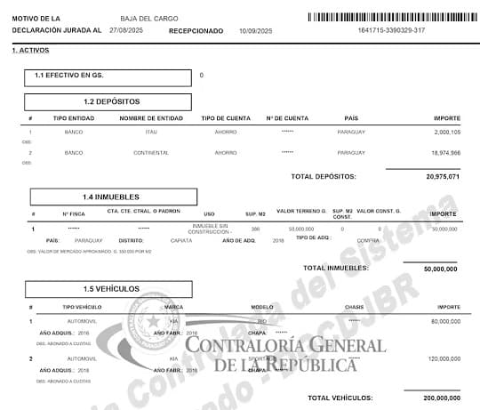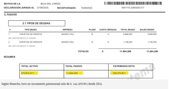 Rodríguez asumió en 2021 declarando un patrimonio neto de G. 118 millones. Su última declaración, presentada tras renunciar en medio de un informe demoledor de la intervención liderada por Carlos Pereira, refleja un crecimiento considerado “austero”. El documento resalta además que no posee inmuebles en Asunción, a pesar de haber sido intendente de la capital.