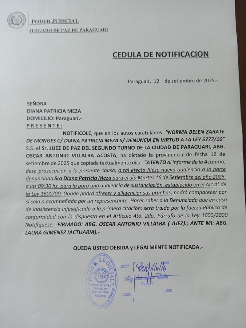 Diana Patricia Meza continúa su batalla legal contra una medida judicial que considera censura pura. La causa NORMA BELÉN ZÁRATE DE MONGES C/ DIANA PATRICIA MEZA S/ DENUNCIA EN VIRTUD A LA LEY 5777/16 tiene nueva audiencia el martes 16 de septiembre a las 09:30 horas.