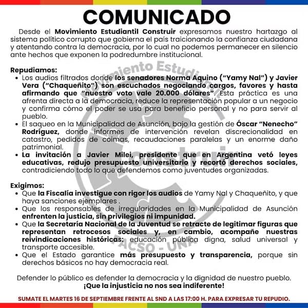 En el comunicado estudiantil repudian varios hechos recientes, incluyendo el audio filtrado que involucra a los senadores Norma Aquino “Yamy Nal” y Javier Vera alias “Chaqueñito”. También destacan los hechos de corrupción en la Municipalidad de Asunción durante la administración del intendente Óscar “Nenecho” Rodríguez, colorado cartista, evidenciando un patrón de irregularidades en diferentes niveles gubernamentales.