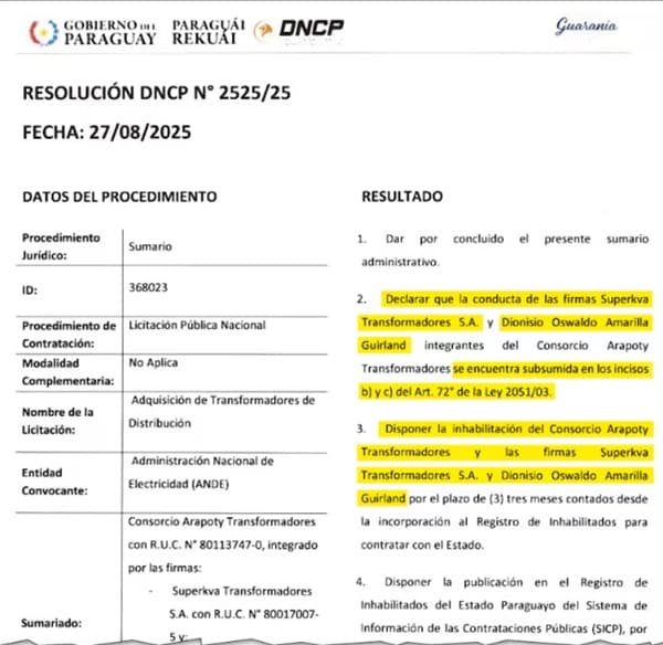 El 27 de agosto de 2025, la Dirección Nacional de Contrataciones Públicas (DNCP) resolvió inhabilitar por tres meses al Consorcio Arapoty Transformadores y a sus empresas integrantes: Superkva Transformadores SA y Dionisio Oswaldo Amarilla Guirland. La medida fue adoptada por incumplimiento contractual y mala fe en un contrato con la Administración Nacional de Electricidad (ANDE).