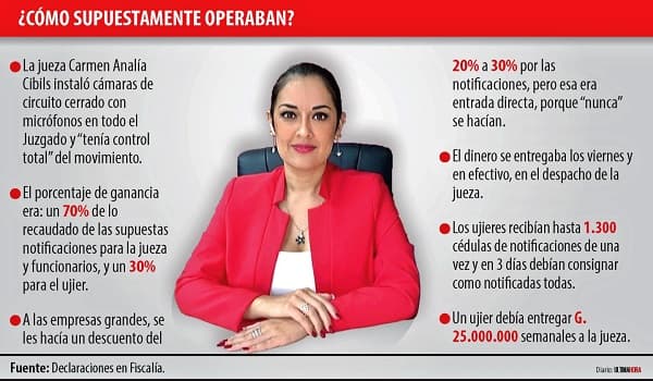 La Fiscalía presentó acusación contra 61 personas esta semana, incluyendo a la jueza Cibils y múltiples funcionarios judiciales. Diecinueve empresas de cobranza están involucradas en la trama que operaba en cuatro Juzgados de Paz. Los G. 25 millones semanales que recibía Cibils representan solo una parte del esquema corrupto que generaba millones mediante notificaciones falsas y expedientes manipulados por empresas privadas de cobranza.