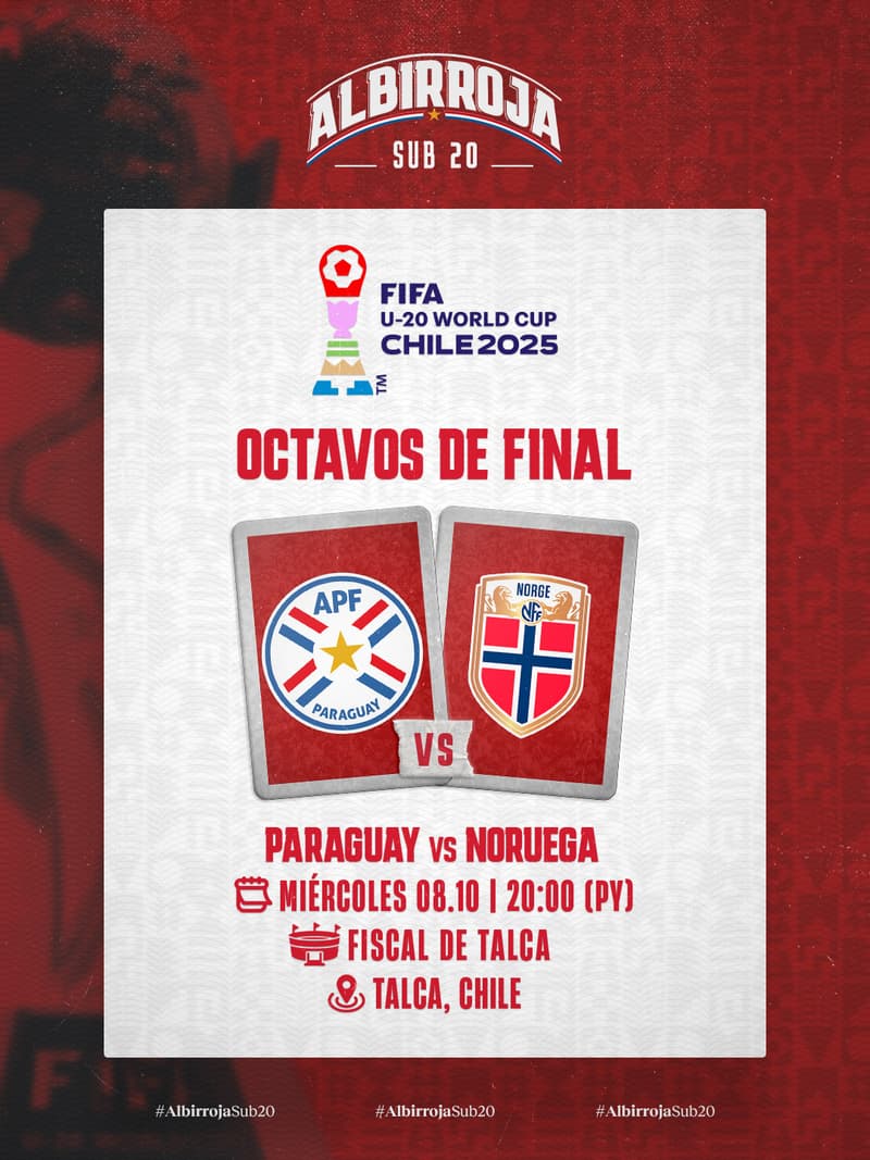 La selección paraguaya Sub 20 ya tiene rival en los octavos de final del Mundial de Chile. El conjunto nacional enfrentará a Noruega este miércoles, a las 20:00, en el estadio de Talca, en un duelo clave por la clasificación a los cuartos del certamen juvenil organizado por la FIFA.
