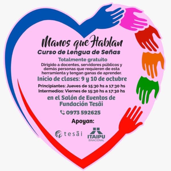 La Fundación Tesãi y la Itaipú Binacional lanzan una nueva edición del curso gratuito de lengua de señas “Manos que hablan”, una iniciativa que promueve la comunicación inclusiva y el acceso equitativo a la educación. El programa arrancará el jueves 9 y viernes 10 de octubre, en el Salón de Eventos de la Fundación Tesãi, en Ciudad del Este.