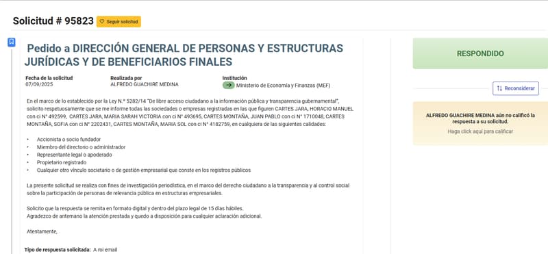 El planteamiento surge tras la solicitud N° 95823, por la cual Guachiré pidió al MEF información sobre participaciones societarias, cargos en directorios y titularidades de empresas relacionadas con los Cartes. La defensa sostuvo que la divulgación de estos datos pondría en riesgo la seguridad física y jurídica de la familia.