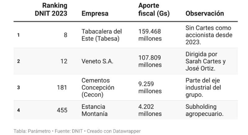 Según la DNIT, el conglomerado aportó G. 448.875 millones en tributos en 2023, un 31 % más que en 2021. Cuatro empresas del entorno Cartes figuran entre las 500 mayores contribuyentes: Tabesa, Veneto S.A., Cementos Concepción y Estancia Montaña.