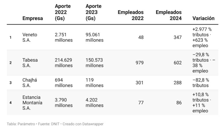 El impacto fue desigual. Veneto S.A. incrementó sus aportes fiscales un 2.977 %, mientras que Tabesa redujo un 29,8 %. Pese a la sanción, el grupo mantuvo más de 6.300 trabajadores, según el IPS.
