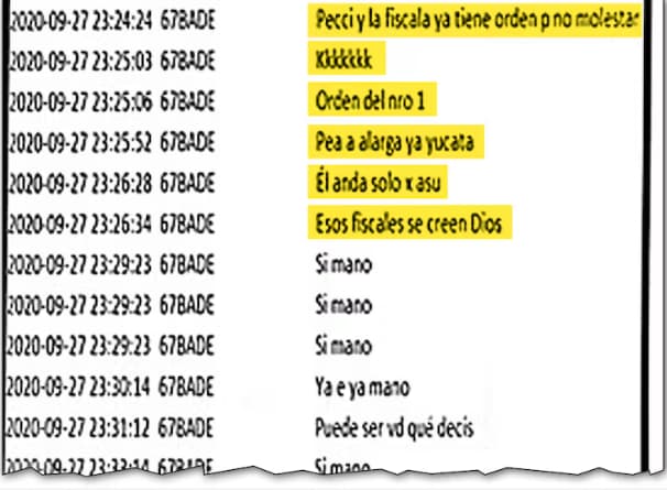 Las conversaciones siguen y en la captura del 27 de setiembre de 2020 se lee: “Pero gracias a Dios ya está resolvido tu lado. Ahora solo contar hasta martes dps (después) ya era. (Marcelo) Pecci y la fiscala ya tiene orden p (para) no molestar. Kkkkkk. Orden del nro 1. Pea a (la) larga ya yucata. Él anda solo x asu (Asunción). Esos fiscales se creen Dios” (sic). Esa manifestación, según el informe, contiene la primera insinuación textualmente ligada a una intención de causar daño.