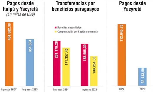 En cuanto a los pagos anuales, el Ministerio informó que las transferencias desde Yacyretá se redujeron de USD 112 millones a apenas USD 32,7 millones, lo que representa una baja del 70,8%. Las remesas desde Itaipú también disminuyeron: los royalties pasaron de USD 201,1 millones a USD 188,6 millones, y la compensación por cesión de energía cayó 22,2%, de USD 171,3 millones a USD 133,2 millones.