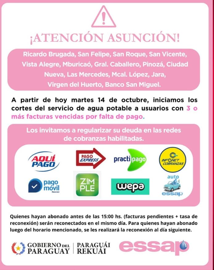 La Empresa de Servicios Sanitarios del Paraguay (Essap) puso en marcha este martes un operativo para cortar el servicio a unos 15.000 usuarios que acumulan más de tres facturas impagas. La medida alcanza tanto a particulares como a instituciones públicas, según confirmó el gerente comercial de la entidad, Óscar Anuar Gosse.