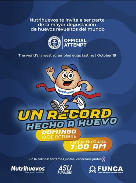 Paraguay se prepara para un desafío histórico: lograr la mayor degustación de huevos revueltos del mundo e ingresar al Libro Guinness de los Récords. El evento se desarrollará en el marco de la corrida solidaria “Corremos juntos, vencemos juntos”, organizada por ASU Runners y la Fundación Unidos Contra el Cáncer (Funca).
