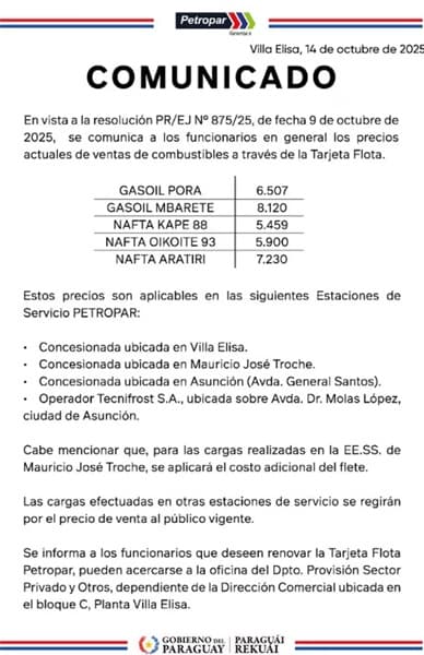 La empresa estatal Petropar implementó una reducción en los precios de combustibles destinada exclusivamente a sus funcionarios. La medida fue oficializada a través de la resolución N° 875/25 del 9 de octubre de 2025 y comenzó a aplicarse este mes.