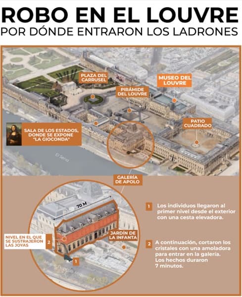El punto de entrada fue una zona en obras ubicada en la fachada que da al río Sena. Esta área, menos vigilada por las reformas, se convirtió en el punto débil del museo más visitado del mundo. Los ladrones usaron un montacargas similar al empleado en mudanzas para llegar directamente al primer piso.
