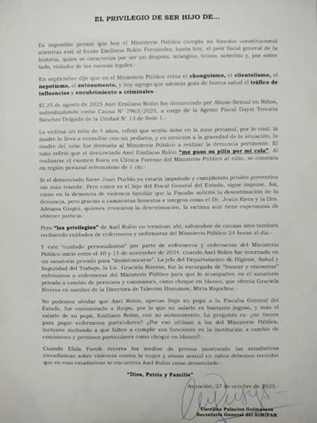 La secretaria general del Sindicato del Ministerio Público (SIMIPAR), Carolina Palacios Guimaraes, denunció que el hijo del Fiscal General del Estado, goza de privilegios institucionales pese a enfrentar graves acusaciones, entre ellas una por abuso sexual en niños.