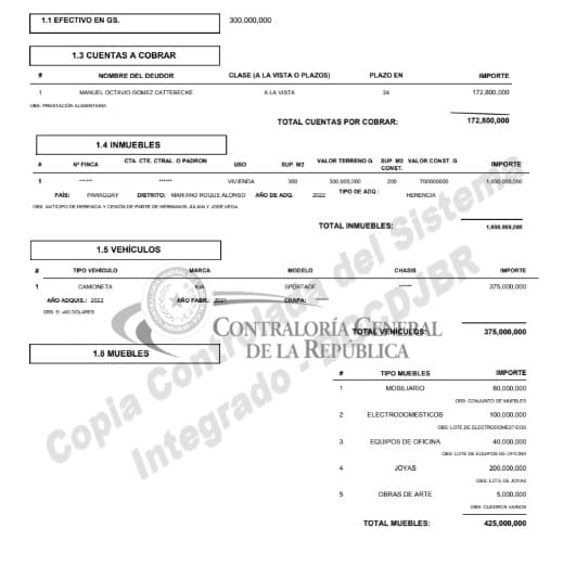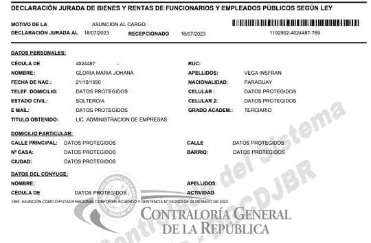 Unite a nuestro canal de WhatsappSin embargo, los números hablan por sí solos. Según su declaración jurada presentada en 2023, Vega reportó un patrimonio neto de G. 2.141 millones, una vivienda valuada en G. 1.000 millones y una camioneta aún en cuotas. Además, declaró joyas por G. 200 millones, electrodomésticos por G. 100 millones y obras de arte por G. 5 millones.