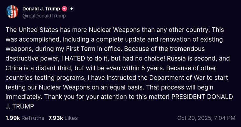 El anuncio fue realizado por Trump en su cuenta de Truth Social. Se produjo horas antes de su encuentro programado con el presidente chino Xi Jinping en Corea del Sur. Estados Unidos ha mantenido una moratoria voluntaria sobre pruebas nucleares explosivas desde 1992, un statu quo que ahora el presidente busca romper.