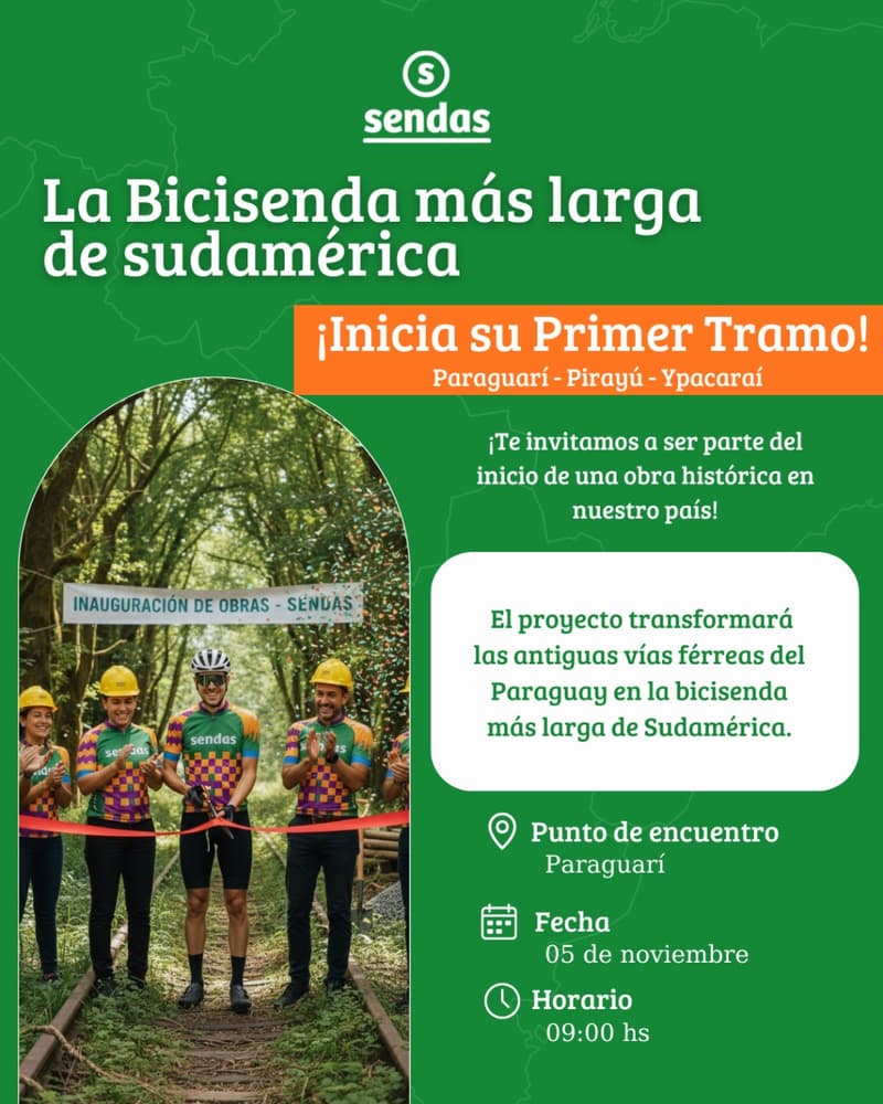 Mañana, miércoles, se pondrá en marcha el primer tramo del proyecto “Sendas del Tren” entre Paraguarí y Cerro León, marcando el inicio de la construcción de la bicisenda más larga de Sudamérica, con más de 420 kilómetros de extensión.