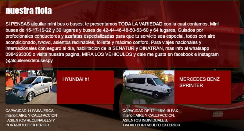 Alquileresdebusespy se promociona en su web con seguro vigente y habilitaciones de SENATUR y DINATRAN. Sin embargo, al verificar fuentes oficiales se constató que la empresa no figura en SENATUR y en DINATRAN tiene vencida la habilitación y el vehículo propio fue dado de baja en fecha 10 de noviembre de 2025.