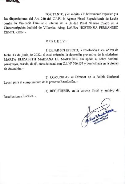Al ser informados de lo ocurrido, sus familiares comenzaron una revisión del expediente judicial, donde constataron que la imputación afectaba a dos personas distintas con nombres idénticos pero con números de cédula diferentes. Tras la intervención de la fiscal adjunta de Guairá, Natalia Fúster, se ordenó el levantamiento inmediato de la orden de captura y se notificó a la Policía Nacional.