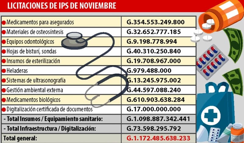 El Instituto de Previsión Social (IPS) avanza en la recta final del año con un alto volumen de procesos de compra, que suman USD 169 millones según los datos publicados en la Dirección Nacional de Contrataciones Públicas (DNCP). Durante noviembre, la institución abrió 28 convocatorias y mantiene 15 licitaciones activas, con cronogramas que abarcan múltiples rubros vinculados a la atención sanitaria y a servicios administrativos.