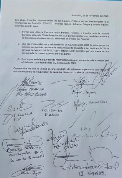 El acuerdo establece la formalización de la alianza electoral bajo el nombre Unidos por Asunción, que deberá inscribirse antes del 15 de diciembre. Además, se definió que la candidatura a la intendencia será única, y la candidata se seleccionará mediante una encuesta programada para la última semana de febrero. El resultado se oficializará el 2 de marzo.