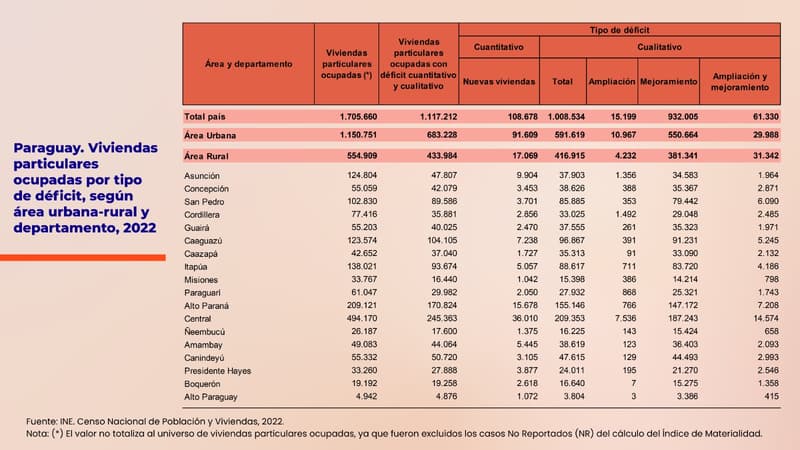 Según datos del Instituto Nacional de Estadística (INE), Paraguay registra 1.117.212 viviendas particulares ocupadas con algún tipo de déficit habitacional. Esta cifra reúne tanto la necesidad de nuevas construcciones como las carencias de infraestructura que requieren mejoras urgentes. El indicador, que abarca situaciones de hacinamiento, deterioro y precariedad, muestra la magnitud del desafío para garantizar condiciones dignas a más de un millón de familias en el país.