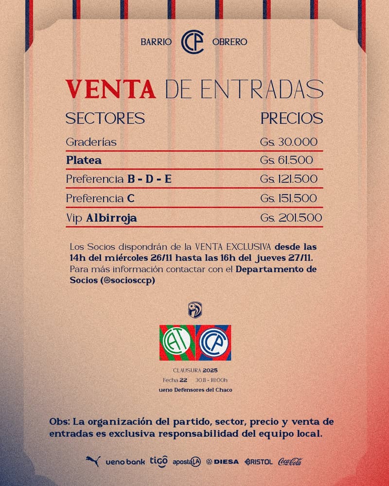La institución invitó a los socios a realizar la compra con anticipación para acompañar al equipo en un compromiso que podría definir la temporada. En la misma publicación, se reiteraron los precios establecidos para este sistema alternativo: Graderías, G. 30.000; Plateas, G. 60.000; Preferencias laterales, G. 120.000; Preferencia central, G. 150.000; y Albirroja Vip, G. 200.000. Se observa una leve diferencia en algunos sectores respecto al anuncio general, según los datos difundidos por el club.