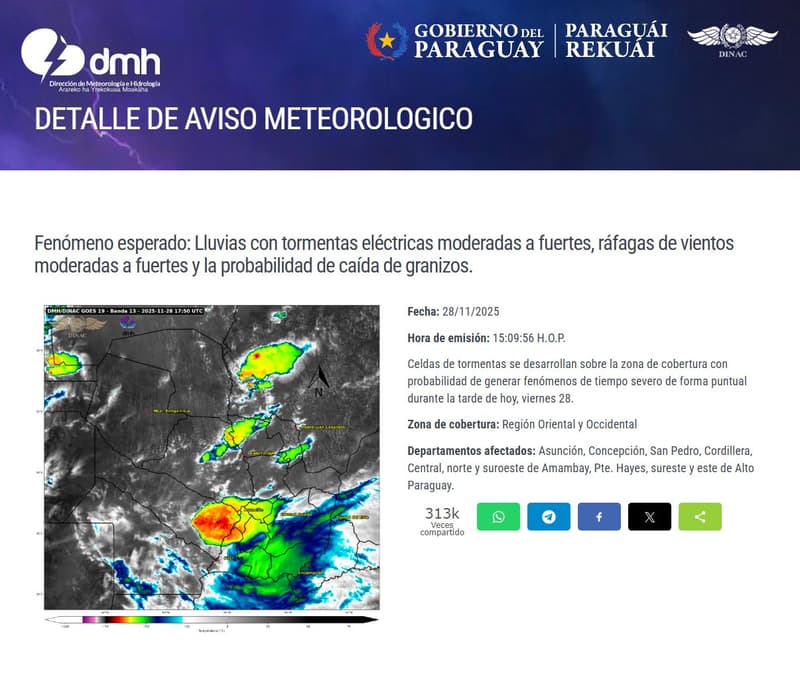 La Dirección de Meteorología volvió a lanzar una alerta este viernes por la tarde y advirtió que Asunción está entre las zonas con mayor riesgo de tormentas fuertes. El aviso se publicó a las 15:09 y señala que el clima cambió rápido, aumentando la chance de lluvias intensas, rayos y ráfagas de viento en la capital y alrededores.