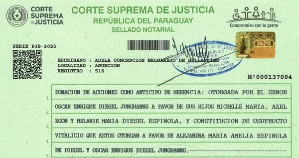 Óscar Diesel declaró ser titular de 13.320.862 acciones nominativas de CARSA. El valor nominal total asciende a G. 13.320.862.000. La donación se realizó a favor de sus hijos Michelle, Axel y Melanie Diesel Espínola. A la vez, los beneficiarios constituyeron un usufructo vitalicio en favor de Óscar Diesel y su esposa.