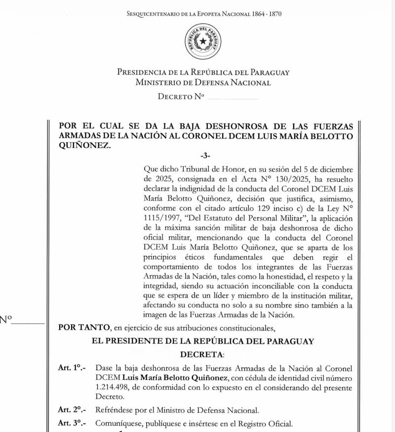 La Presidencia de la República informó que el jefe del Ejecutivo firmó el decreto que formaliza la baja deshonrosa del entonces coronel CDEM. El documento establece que Belotto deja de formar parte del cuadro de oficiales de las Fuerzas Armadas. Además, vincula directamente la sanción con la condena penal dictada en su contra en el marco del caso Tío Rico.