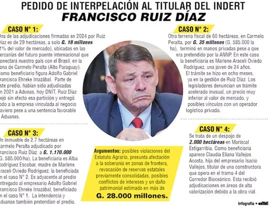 https://www.rdn.com.py/2025/12/09/indert-denuncia-presunto-fraude-con-tierras-del-chaco-y-senala-a-gestion-anterior/El pedido de interpelación, presentado como punto número 11 del orden del día, será tratado en una sesión presidida por Basilio “Bachi” Núñez. Legisladores opositores y disidentes aseguran contar con los votos necesarios para impulsar un cambio en la conducción del INDERT, y la sesión de hoy podría definir el futuro del titular de la institución.