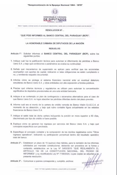 En paralelo, se aprobó otro pedido dirigido al Banco Central. En este caso, Diputados solicita información sobre la autorización del diferimiento de pérdidas otorgada a ueno Bank, las condiciones para su continuidad operativa y los controles aplicados para verificar los aportes de capital comprometidos por sus accionistas.