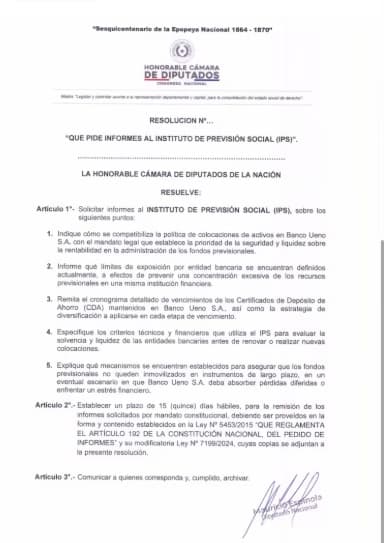 Unite al canal de RDN en WhatsappEl pedido remitido al IPS apunta a conocer cómo se define la política de colocación de activos en Banco Ueno S.A., y de qué manera se compatibiliza con la normativa que exige priorizar seguridad y liquidez por encima de la rentabilidad. Diputados solicita además el detalle de los límites de exposición por entidad, así como el cronograma de vencimientos de los Certificados de Depósito de Ahorro (CDA) que el IPS mantiene en el banco.