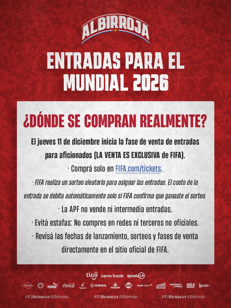 La Asociación Paraguaya de Fútbol (APF) avisó algo básico: no vende entradas para el Mundial 2026. Las consultas explotaron y por eso salió a aclarar. Si querés tu ticket, solo la FIFA lo vende.