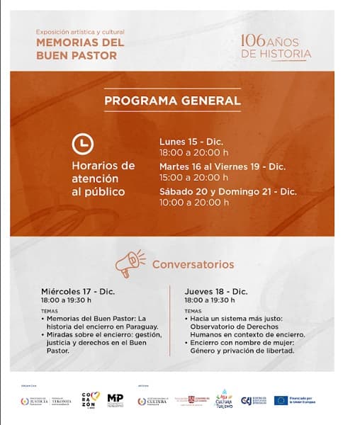 El ex Centro Penitenciario de Mujeres Casa del Buen Pastor volverá a abrir sus puertas como un espacio dedicado al arte y la memoria colectiva. La muestra “Memorias del Buen Pastor: 106 años de historia” se habilitará del 15 al 21 de diciembre. La iniciativa es organizada por el Ministerio de Justicia y el Proyecto Social Corazón Libre del Movimiento Peregrino, con apoyo de la Secretaría Nacional de Cultura, la Municipalidad de Asunción, el Centro de Estudios Judiciales y el financiamiento de la Unión Europea.