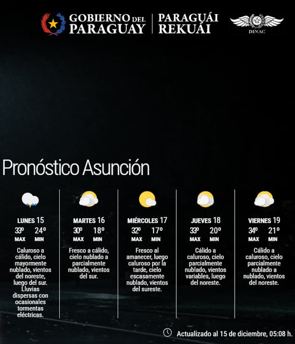 Mientras tanto, en el extremo suroeste del país se espera que desde temprano ingrese un frente frío, que afectará inicialmente a los departamentos de Ñeembucú, Misiones y parte de Itapúa. En estas zonas se prevén lluvias acompañadas de tormentas eléctricas, y no se descarta que, de manera puntual, se presenten fenómenos de mayor intensidad.