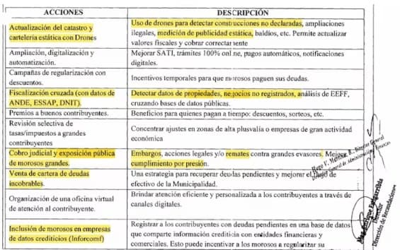 Por otro lado, Bello propone una fiscalización cruzada con la ANDE, la ESSAP y la Dirección Nacional de Ingresos Tributarios (DNIT). El objetivo es ubicar propiedades o negocios no registrados y cerrar brechas de evasión.