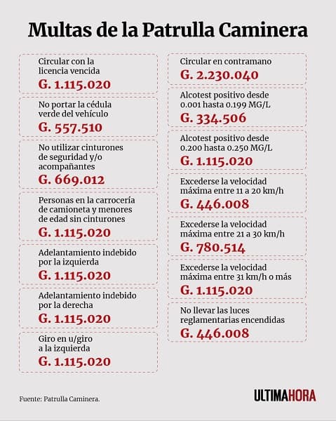 Unite al canal de RDN en WhatsappSegún el esquema vigente, circular con la licencia vencida tiene una multa de G. 1.115.020. No portar la cédula verde implica una sanción de G. 557.510. No usar cinturón de seguridad, tanto el conductor como los acompañantes, se castiga con G. 669.012. En tanto, circular sin las luces encendidas tiene un costo de G. 446.008.