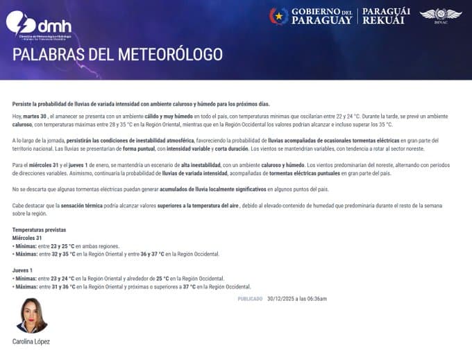 Para el miércoles 31 y el jueves 1 de enero, el pronóstico indica que continuará el escenario de alta inestabilidad. El ambiente seguirá siendo caluroso y con elevada humedad. Además, persistirá la probabilidad de lluvias de variada intensidad, acompañadas de tormentas eléctricas puntuales en gran parte del país.