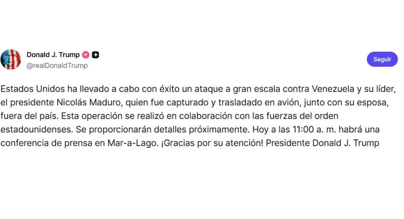 Unite al canal de RDN en WhatsappSegún el comunicado, la operación fue coordinada con fuerzas del orden de Estados Unidos y se desarrolló con éxito. Trump indicó que los detalles completos serían brindados en una conferencia de prensa programada para las 11:00 horas en Mar-a-Lago. El mensaje fue publicado horas después de que se registraran fuertes explosiones en Caracas durante la madrugada.